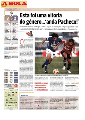 Voltando à táctica de Jaime Pacheco, ao colocar Mano na segunda parte, o Belém ganhava assim a irreverência do seu jogo, daí a sua atitude mais ofensiva e desinibida. Silas, Zé Pedro e Gomez deram consistência ao meio campo, e os dois primeiros foram muito importantes na construção do nosso jogo ofensivo. Na defesa, o destaque vai para Cândido Costa (não percebo a má classificação dele no Record) que esteve espectacular tanto a defender como a atacar. Esta ala direita (Cândido e Vinicius) promete.